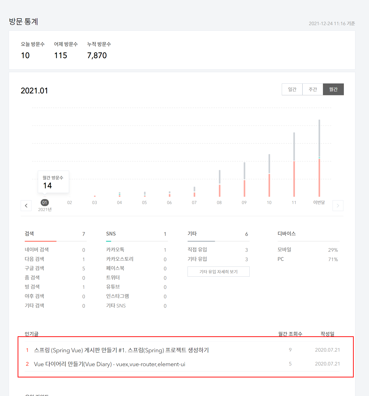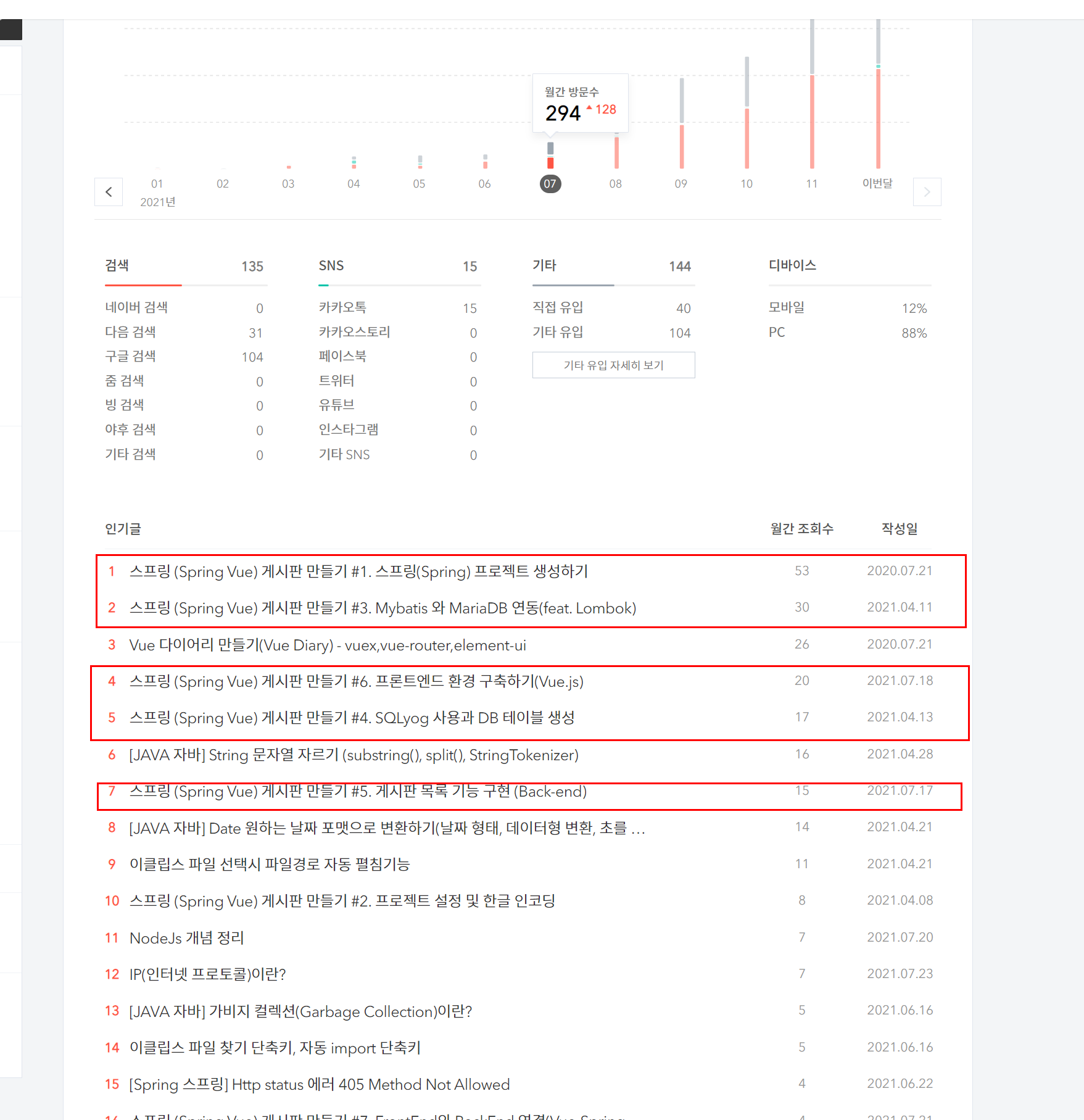 근데 생각보다 스프링 Vue로 게시판 만드는 시리즈의 포스팅이 많이 없고 해당 게시물로의 유입이 많이 된다는 것을 알게 되었습니다.