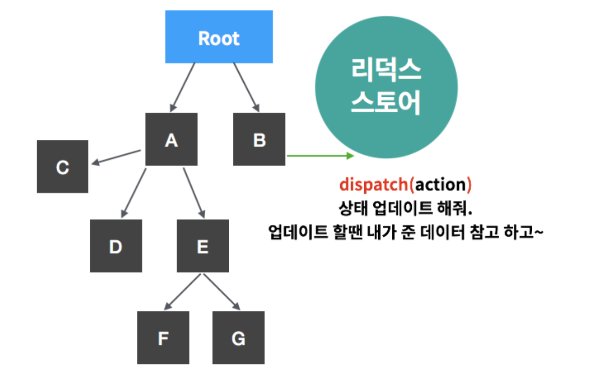 이제 B 컴포넌트에서 어떤 이벤트가 생겨서, 상태를 변화 할 일이 생겼습니다. 이 때 dispatch 라는 함수를 통하여 액션을 스토어한테 던져줍니다.
