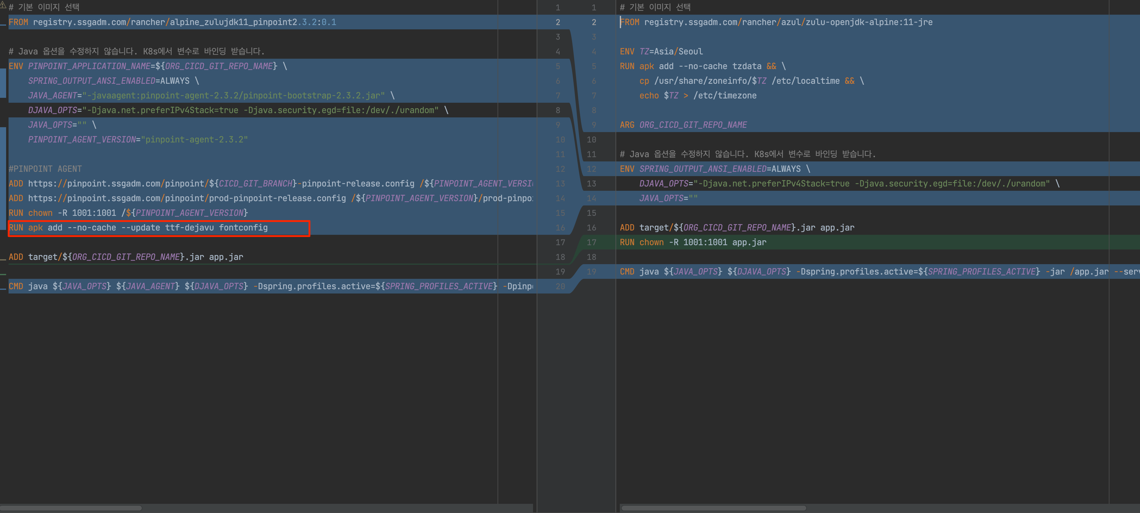 이처럼 Dockerfile에 폰트 설치에 대한 부분을 추가하는 것 아니라 서버에서 fontconfig를 설치해서 사용하는 방법도 있다고 한다. (CentOS 기준)