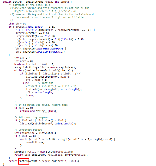 기본적으로 split함수는 내부적으로 정규식에 알맞는 데이터를 Pattern 객체를 새롭게 생성해 만들어낸 문자열을 리턴하는 방식이므로 substring()에 비해서 성능이 떨어지는 방식이므로 가급적이면 substring()을 사용하는 경우라면 굳이 split()함수를 사용하는것은 성능 측면에서는 비효율적입니다.