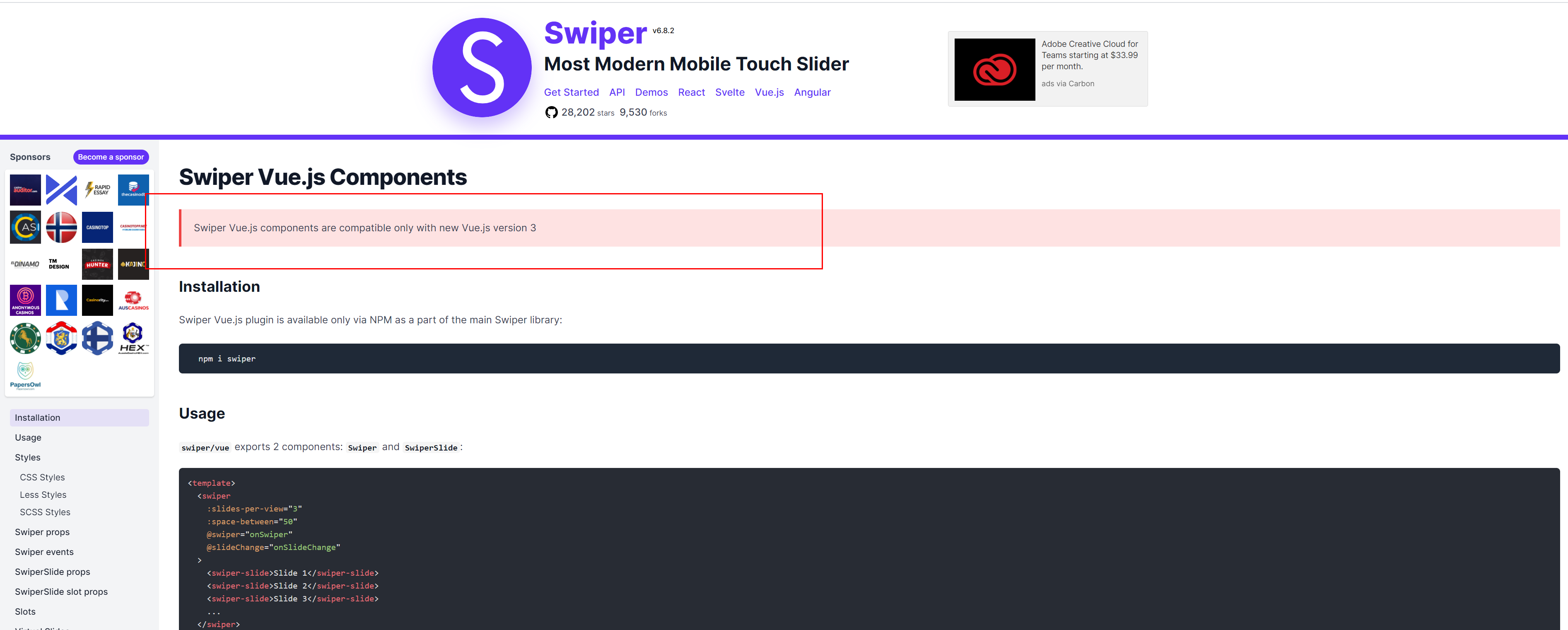 결과적으로는 또 vue의 버전과 맞지않는 문제가 발생해서 vue2에서는 현재(2021.08.19 기준) swiper의 버전이 swiper6버전이 맞지 않아서 swiper 5버전대를 받아서 사용하였습니다.