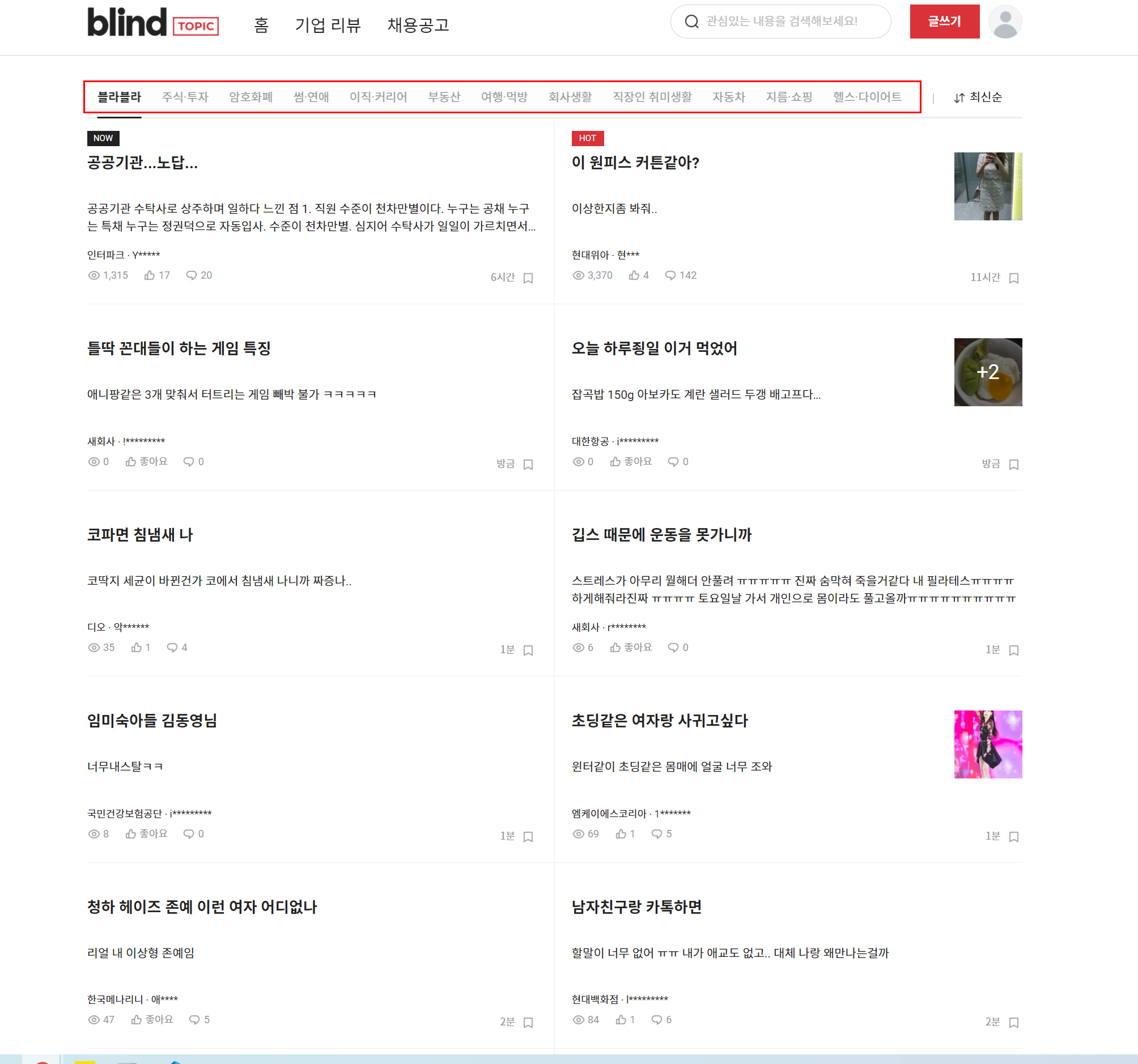블라인드에서 해당 부분처럼 당겨서 밀어내는 방식을 사용하길래 찾던 중 알게된 것이 swiper입니다.
