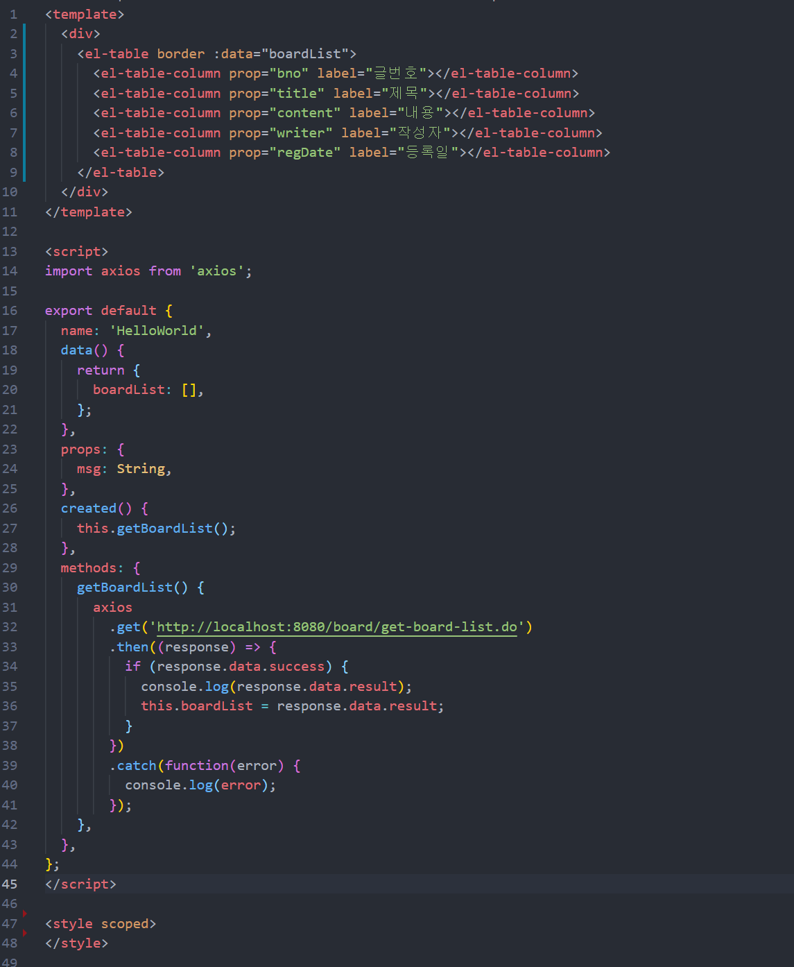<el-table-column prop="writer" label="작성자"> </el-table-column>