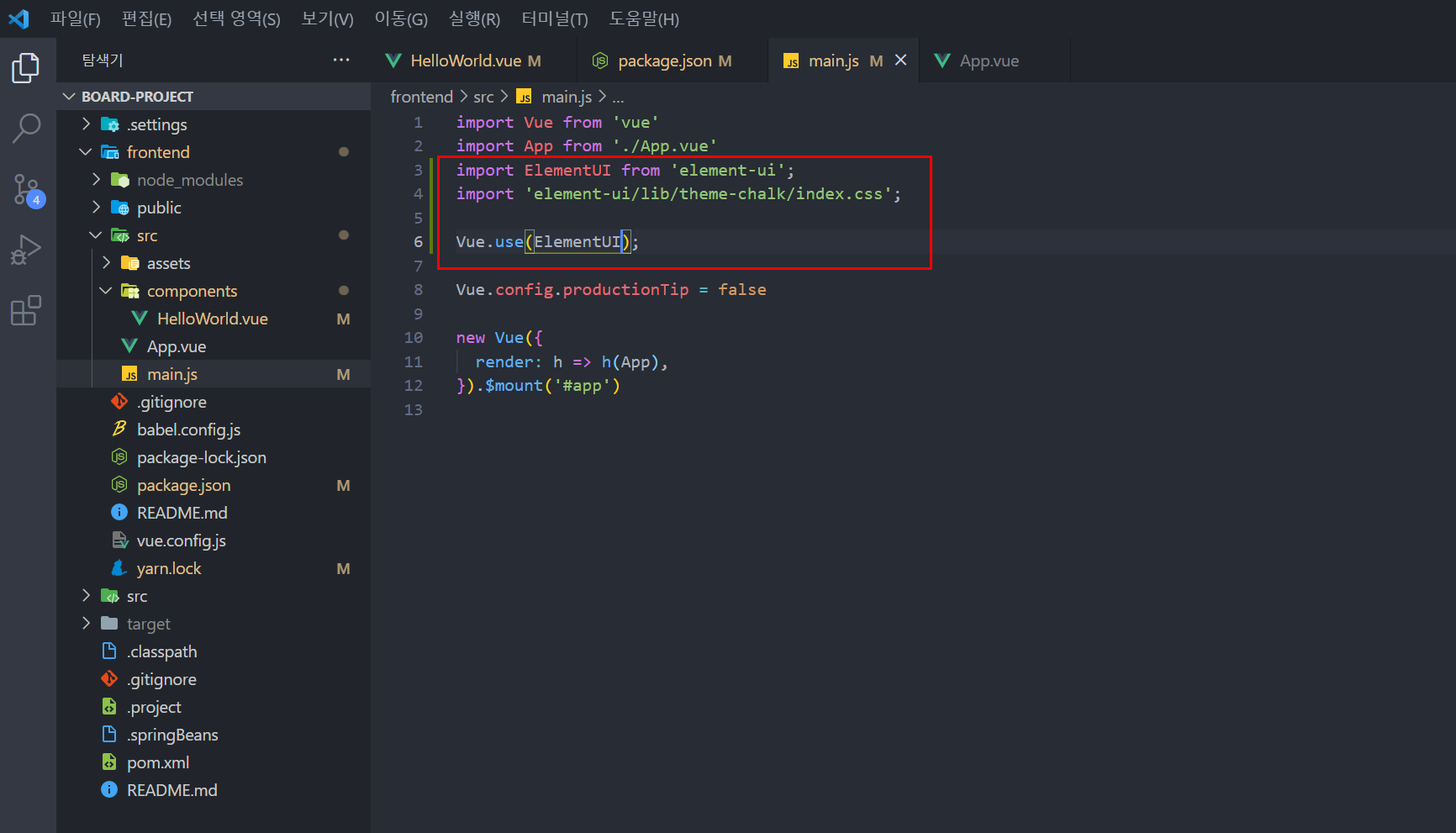 전역에서 element-ui를 사용할 수 있도록 main.js에 element-ui에 import하여 Vue.use(Element-ui)를 추가해주도록 합니다.