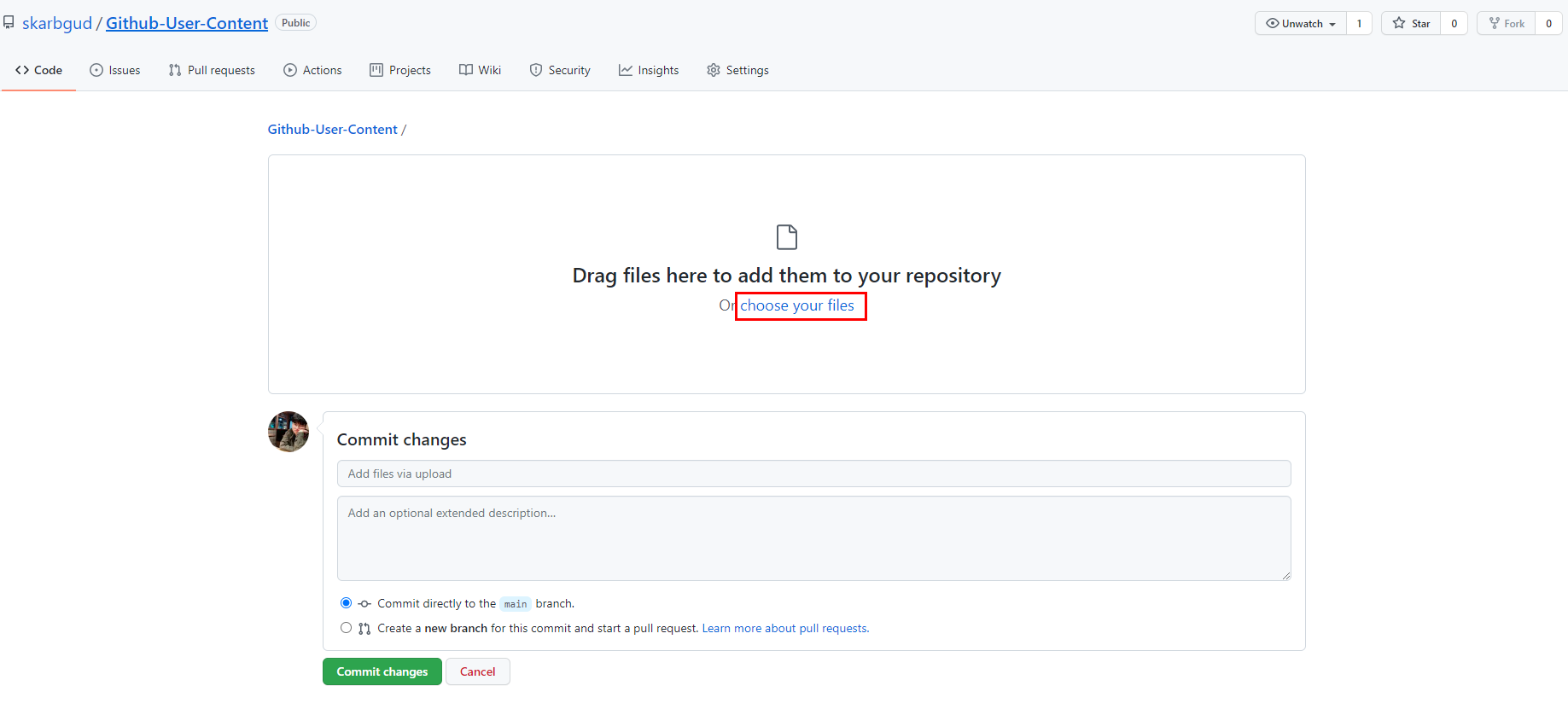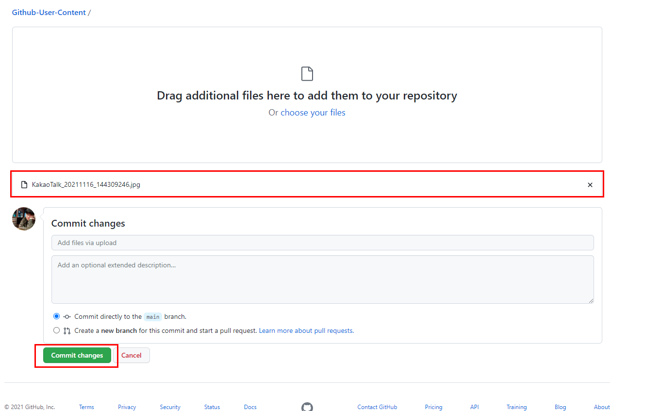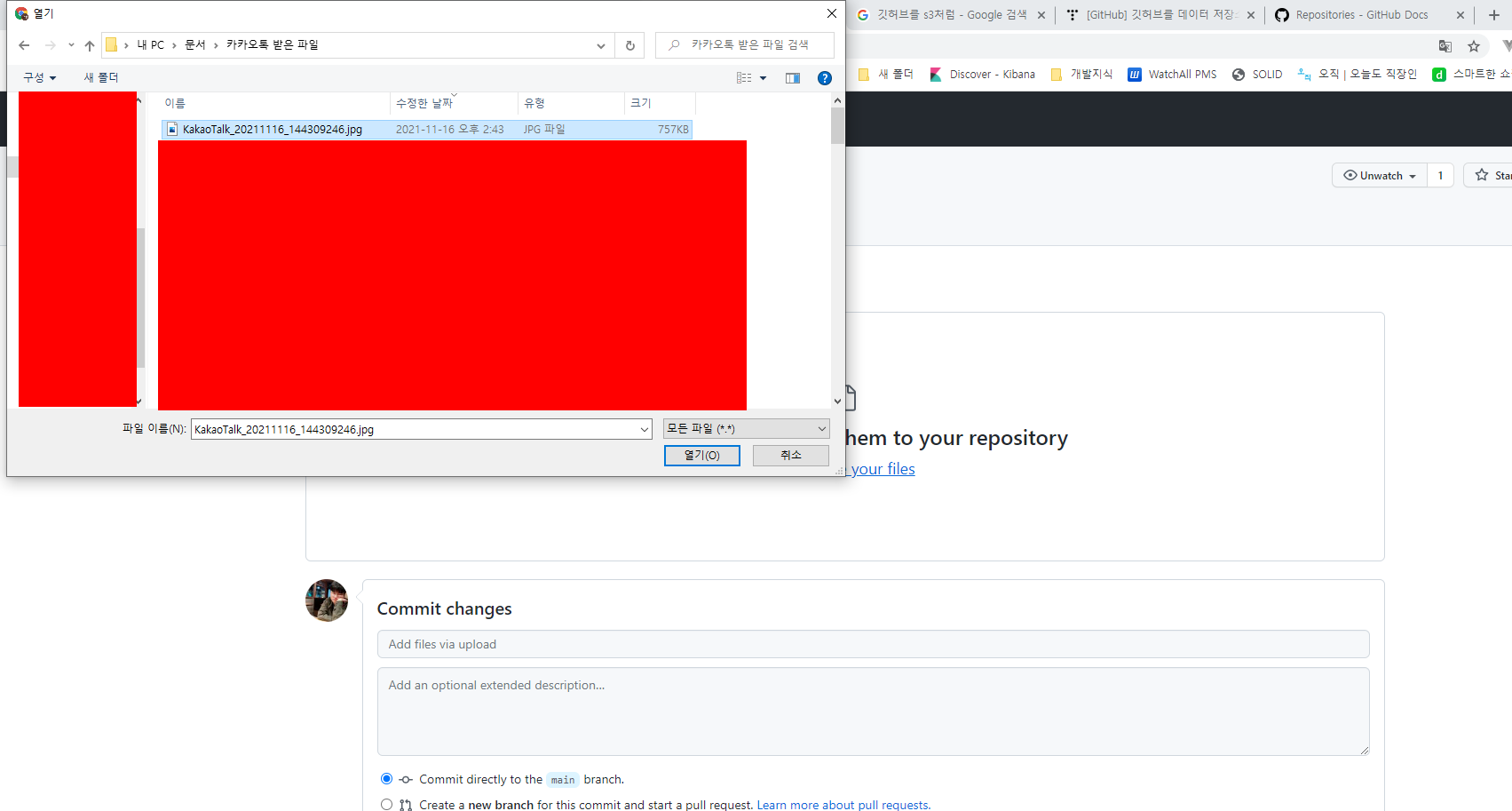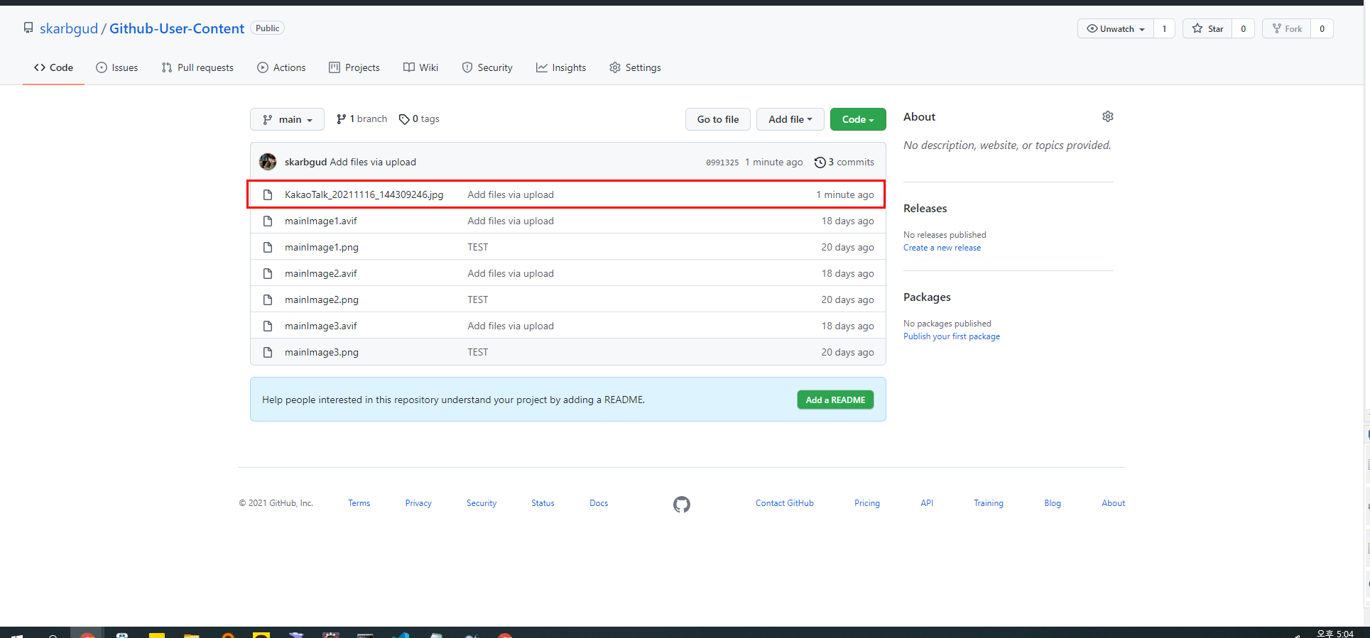 원하는 파일을 업로드 해줍니다. (물론 git clone을 통해서 commit하여 push하는 것도 되지만 간단하게 원하는 이미지만 올릴거라 이렇게 진행했습니다.)