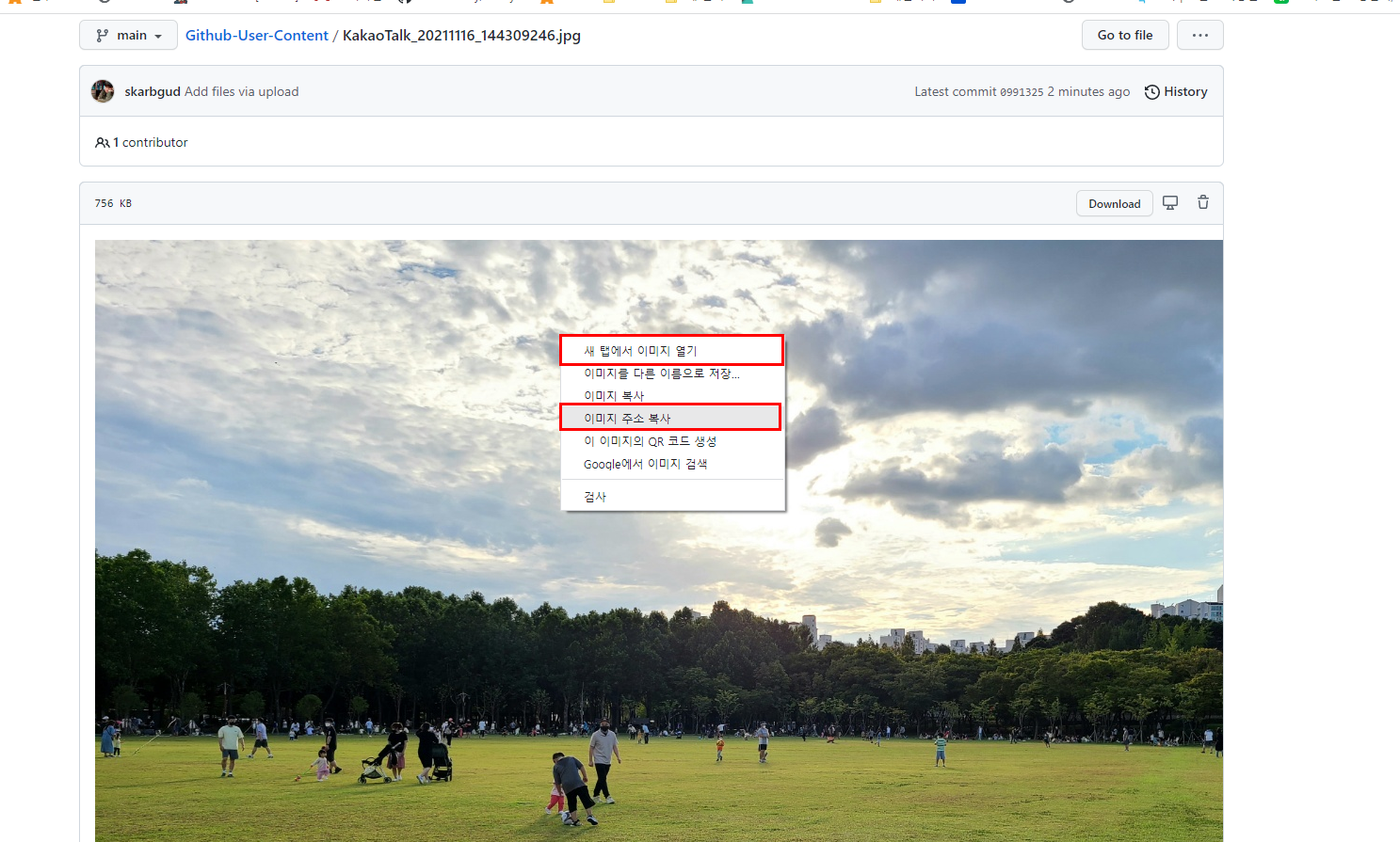 이미지 주소를 복사하거나 새탭에서 이미지 열기를 누르면 해당 파일을 불러올 수 있는 api 주소를 확인할 수 있습니다.