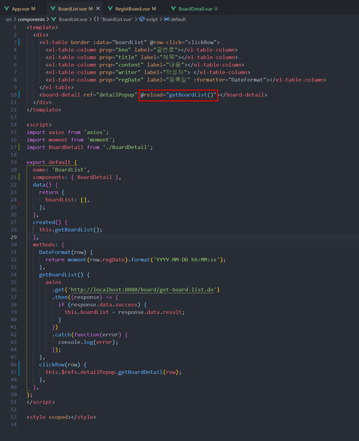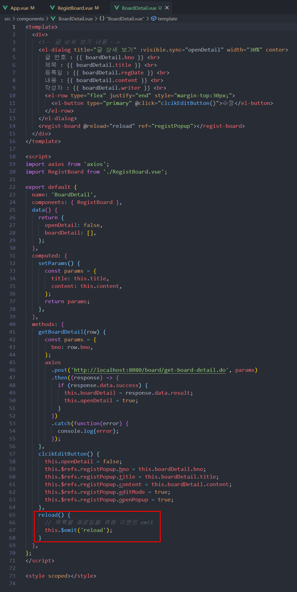 BoardDetail에서 reload를 emit 하는데 BoardDetail에서 emit 한 reload를 boardList에서 처리를 해주도록 하겠습니다.
