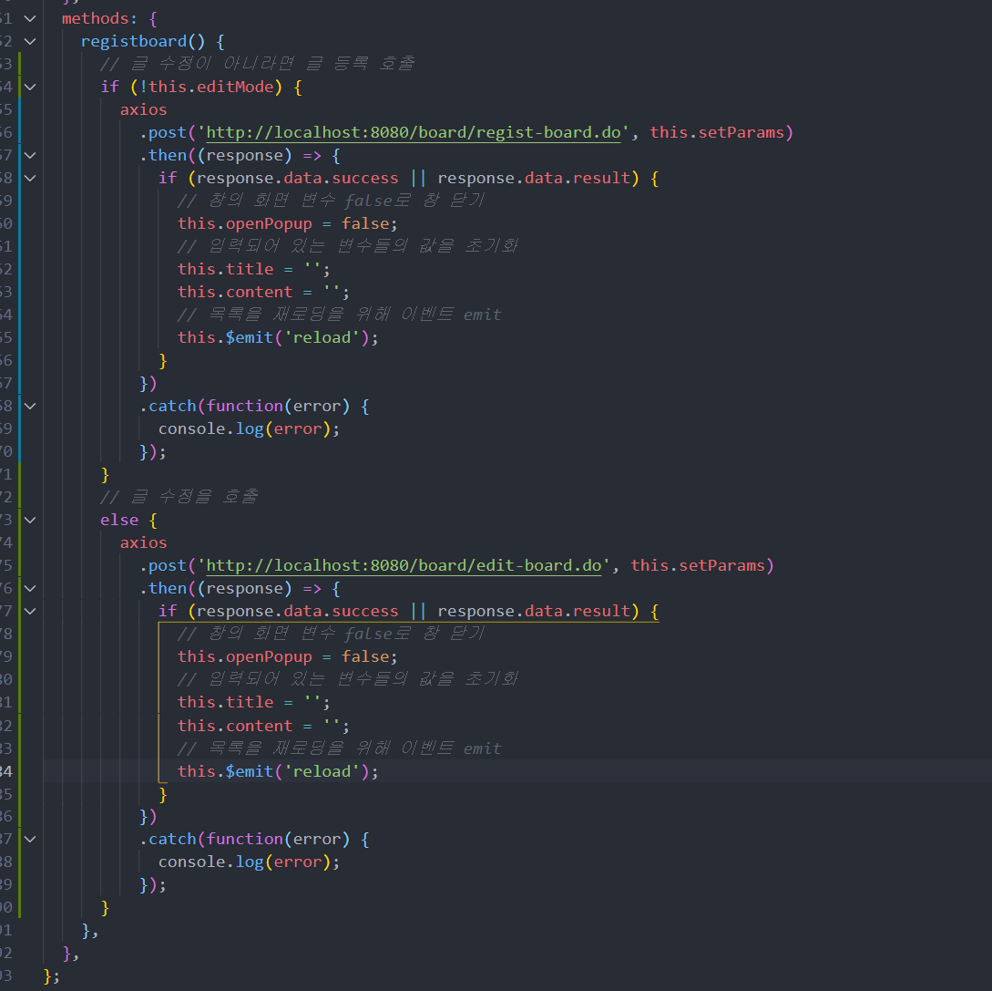 @reload를 emit으로 이벤트를 발생시키면 getBoardList()메소드를 호출하여 목록을 다시 불러주도록 합니다.
