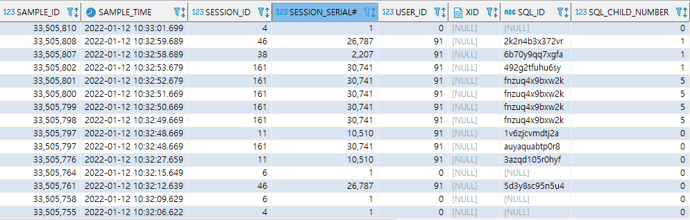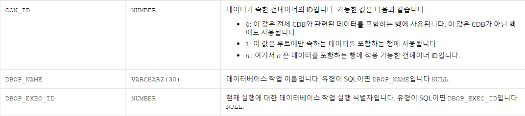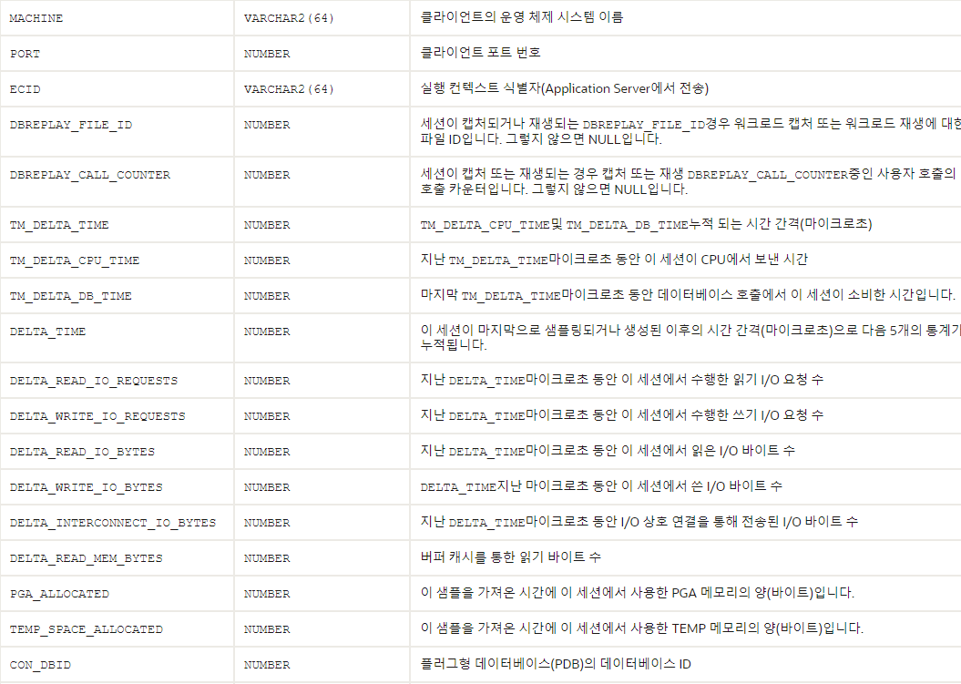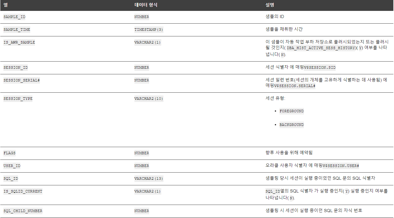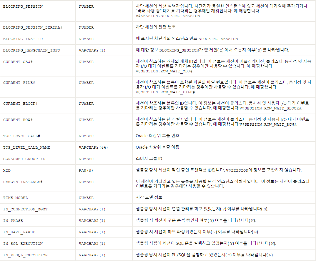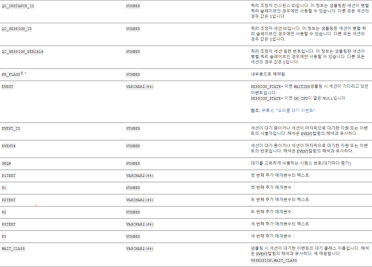 V$ACTIVE_SESSION_HISTORY 컬럼 정보 (참고:https://docs.oracle.com/en/database/oracle/oracle-database/21/refrn/V-ACTIVE_SESSION_HISTORY.html#GUID-69CEA3A1-6C5E-43D6-982C-F353CD4B984C)