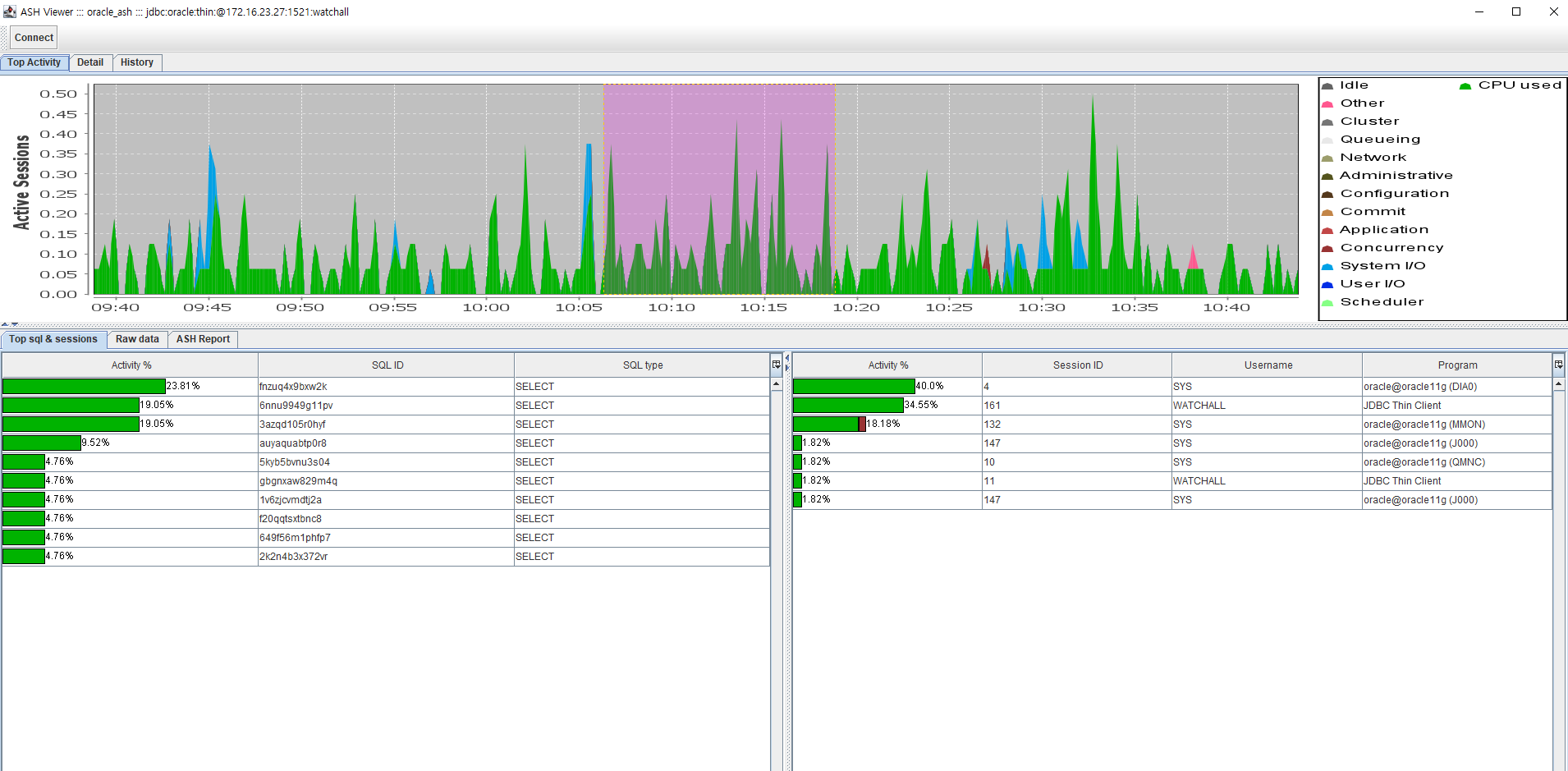 자바 Swing을 이용하여 ASH의 쿼리를 통해 질의 된 결과를 보기 쉽게 차트로 만든 오픈소스입니다.
