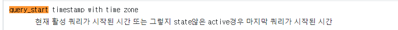 위의 쿼리에서 WHERE절 조건으로 들어가 있는 current_timestamp - query_start > '1 sec'는 현재 활성화 된 쿼리가 시작된 시간이니 현재시간 - 느린쿼리가 활성화가 시작된 시간 = 쿼리가 걸린 시간이 추출되어 ‘[숫자][단위]’로 느린 쿼리를 추출하여 해당 쿼리에 대한 정보를 추출
