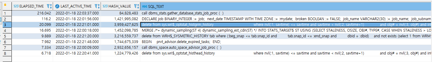 WHERE 절에 ELAPSED_TIME 의 값을 초단위로 설정하여 몇초 이상 걸린 쿼리에 대한 값을 지정하여 오래 걸린 쿼리를 측정 할 수 있다