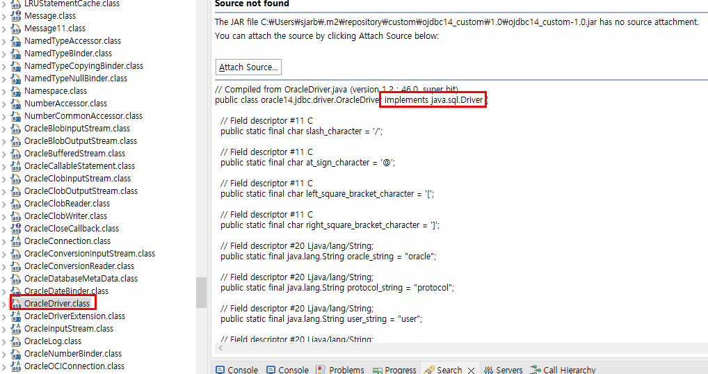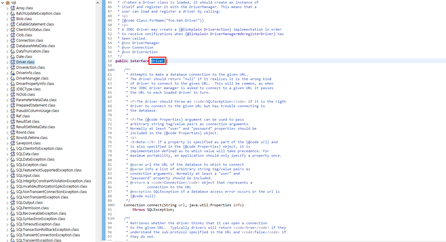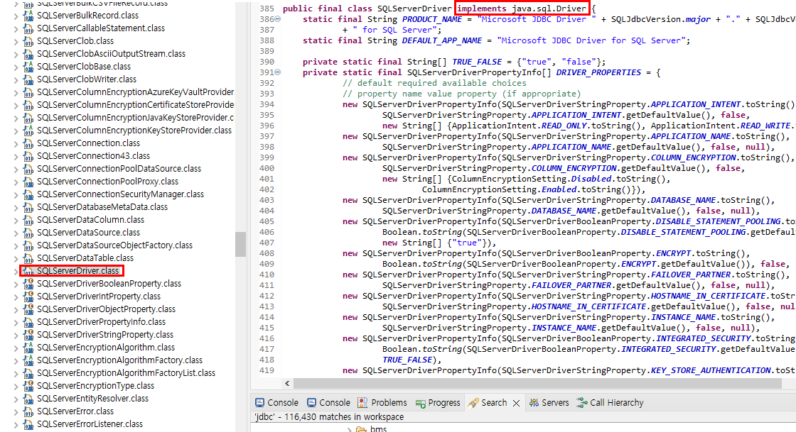 위의 Oracle, SQLServer(ms-sql)에 대한 각 드라이버인 OracleDriver와 SQLServerDriver를 보면 두개의 클래스 모두 java.sql.Driver에 implement를 통해 인터페이스에 구현체를 통해 구현된 클래스임을 알 수 있습니다.