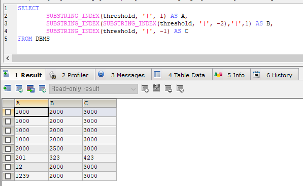 | SUBSTRING_INDEX('THRESHOLD', '|', -3) | 1000|2000|3000 |