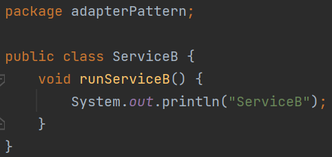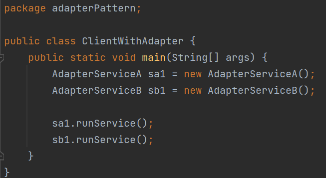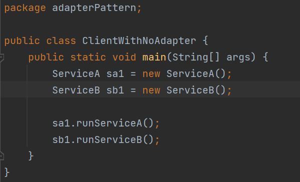 ClientWithNoAdapter 클래스에서 main() 메서드를 보면 sa1 참조 변수와 sb1 참조 변수를 통해 호출하는 각 메서드가 비슷한 일을 하지만 메서드명이 다르다.(sa1은 runServiceA() 메소드 호출, sb1는 runServiceB() 메소드 호출)