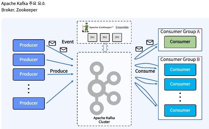 아파치 카프카의 주요 구성 요소는 주키퍼라고 하는 상위에 있는것과 아래의 카프카 클러스터로 구성되어 있습니다.