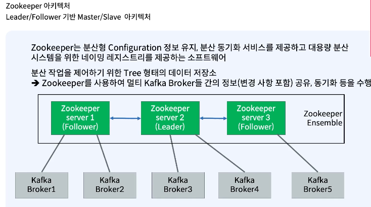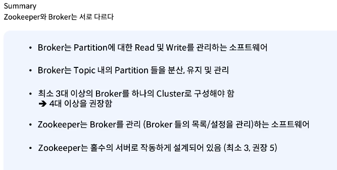 - 주키퍼 없이는 카프카는 동작할 수 없다. but 주키퍼를 없애는 작업들이 진행 중에 있다. (kip[kafka improvement proposal] : 카프카에서 주키퍼를 제거한 버전)