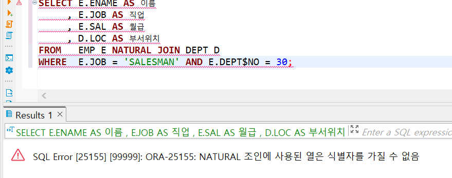 ORA-25155: NATURAL 조인에 사용된 열은 식별자를 가질 수 없음