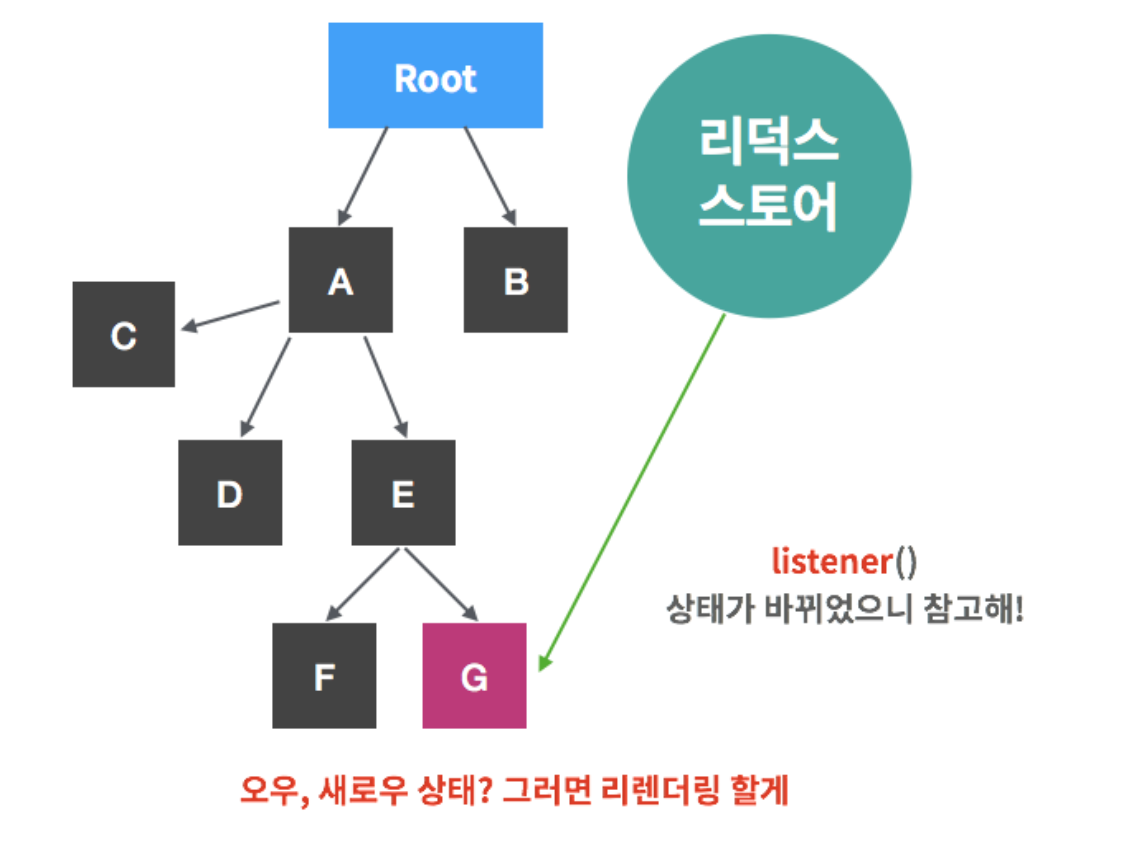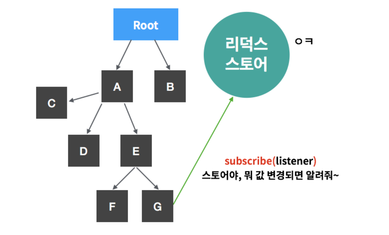G 컴포넌트는 스토어에 구독을 합니다. 구독을 하는 과정에서, 특정 함수가 스토어한테 전달이 됩니다. 그리고 나중에 스토어의 상태값에 변동이 생긴다면 전달 받았던 함수를 호출해줍니다.
