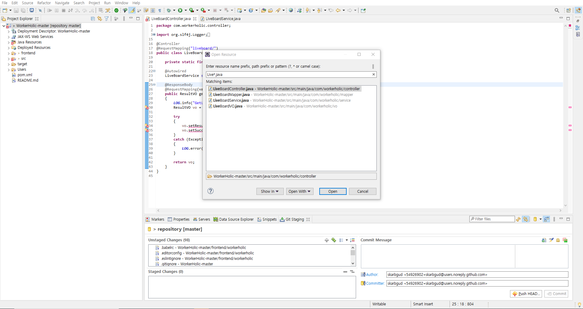 파일 이름을 어느정도 알고 있다면 단축기 CTRL + SHIFT + R 키를 눌러 Open Resource 창을 열고 파일 이름의 전부 또는 일부를 타이핑하여 쉽게 원하는 파일을 찾을 수 있습니다.