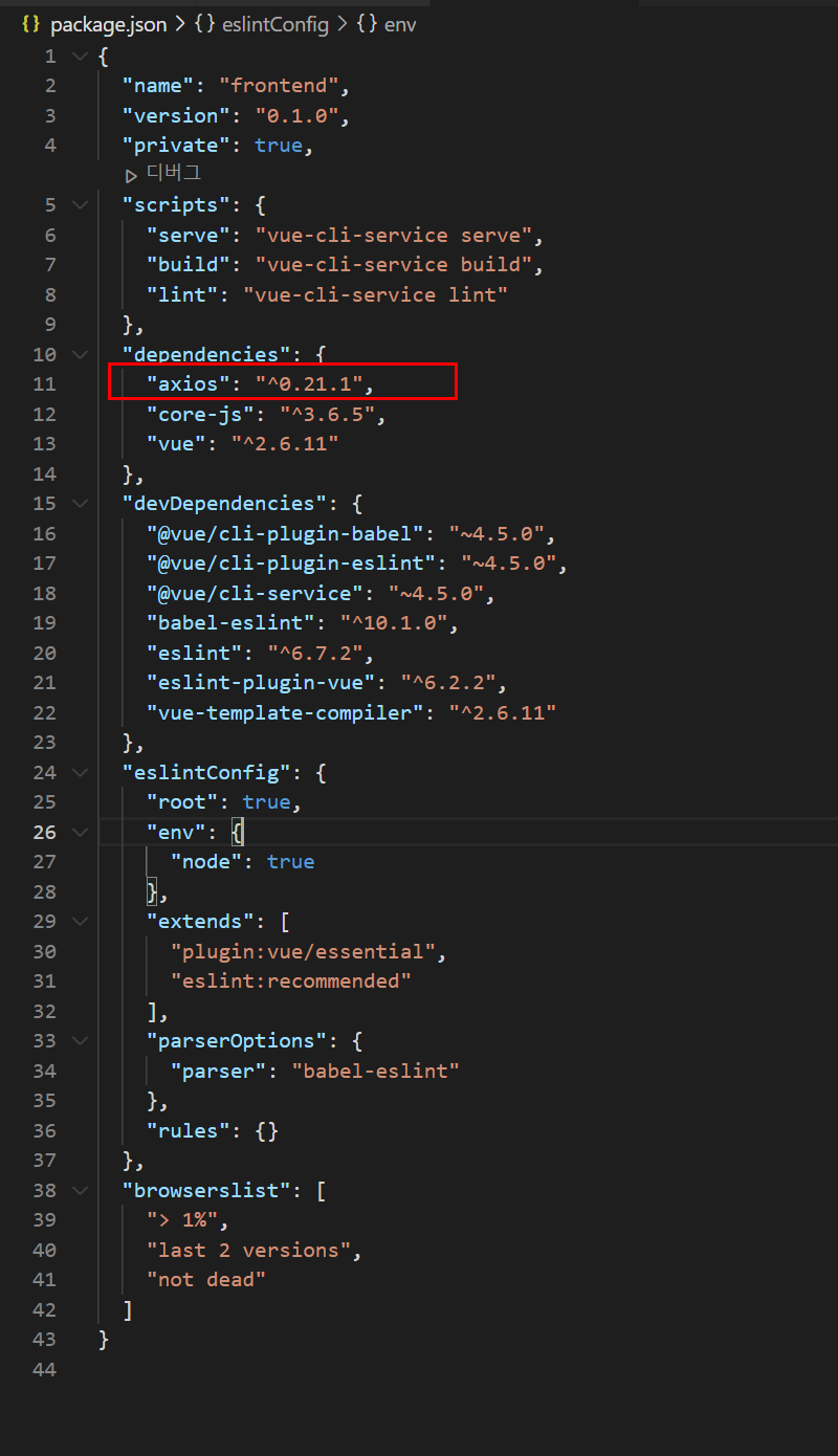 정상적으로 설치가 완료되면 package.json에서도 axios를 확인 할 수 있습니다.