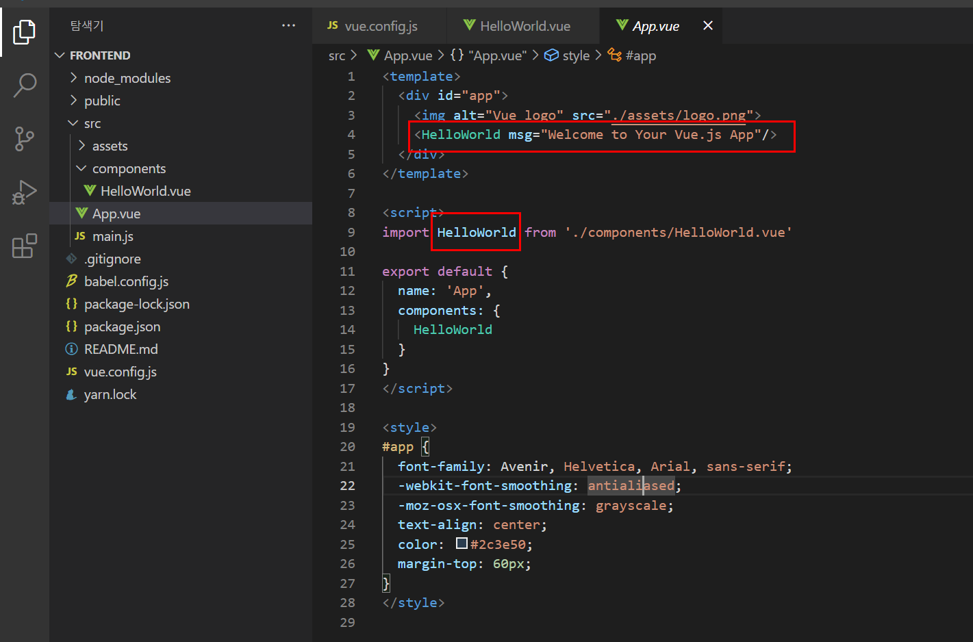 제일 처음 생성한 Vue 프로젝트에서는 Helloworld.vue파일을 호출해서 첫 화면을 띄웁니다.