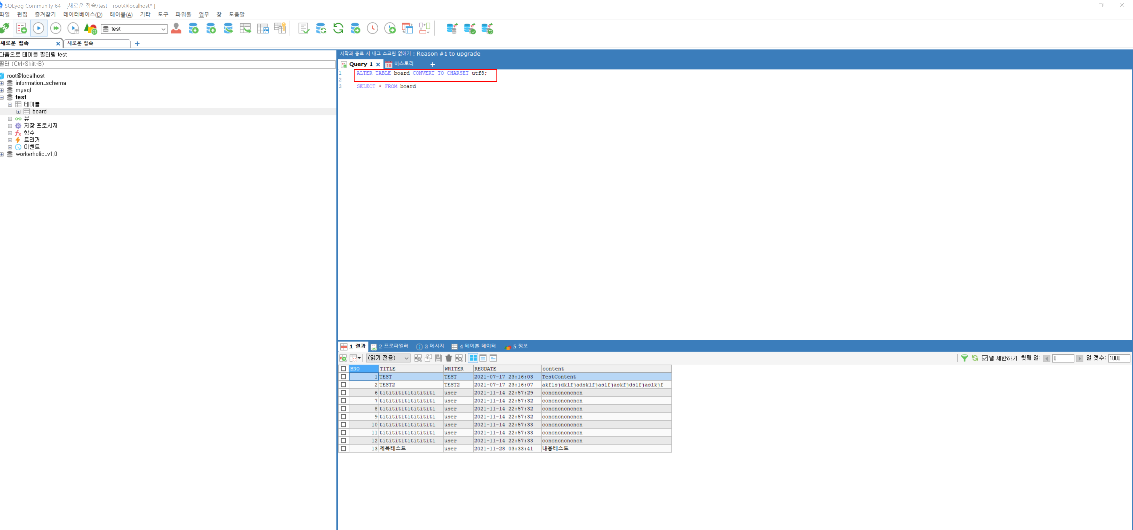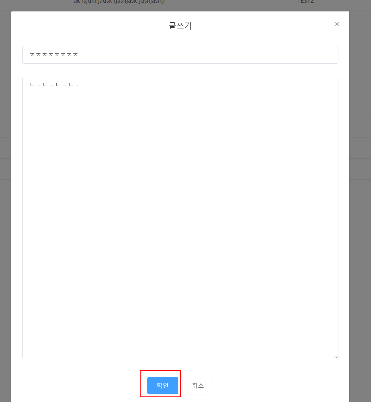 한글로 제목에는 제목테스트, 내용에는 내용테스트로 등록을 진행해보겠습니다.
