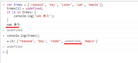 아래와 같이 해당 인덱스에 undefined로 할당하는 경우에는 배열의 요소가 여전히 남아있을 수 있지만