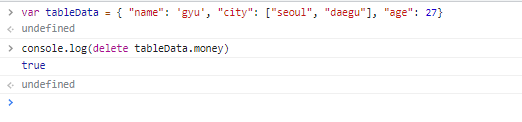 delete연산자는 오브젝트로 부터 해당 프로퍼티를 삭제합니다. 삭제를 하면 true를 반환, 아니면 false를 반환합니다.
