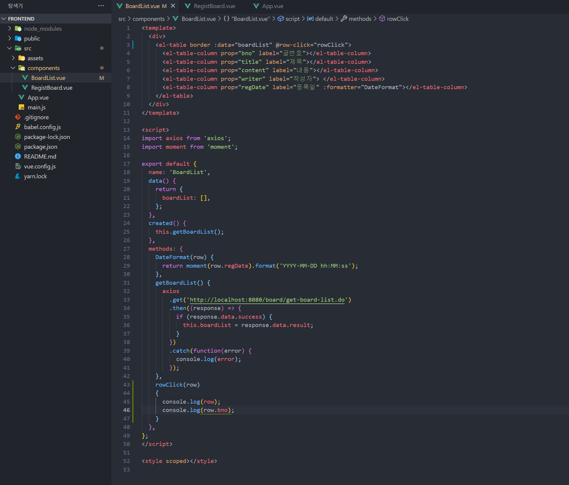 bno를 확인했으니 해당 bno를 파라미터로 axios로 호출하도록 코드를 바꿔주고 rowclick의 메소드도 명확하게 getBoardDetail로 바꿔서 Controller의 메소드의 이름과 동일하게 해서 헷갈리지 않게 바꿔보도록 하겠습니다.