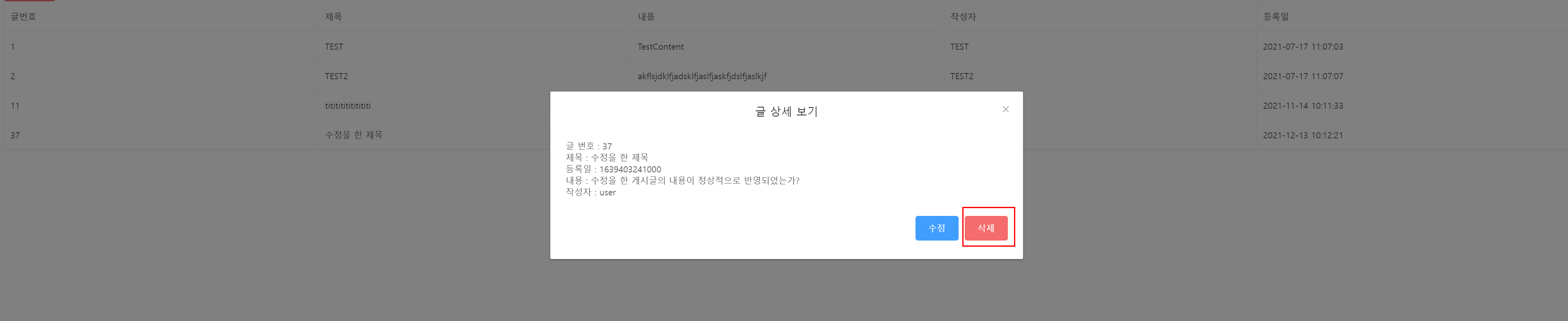 글 상세보기에서 수정 옆에 삭제 버튼을 넣어서 해당 게시글을 삭제하도록 구현을 해보겠습니다.