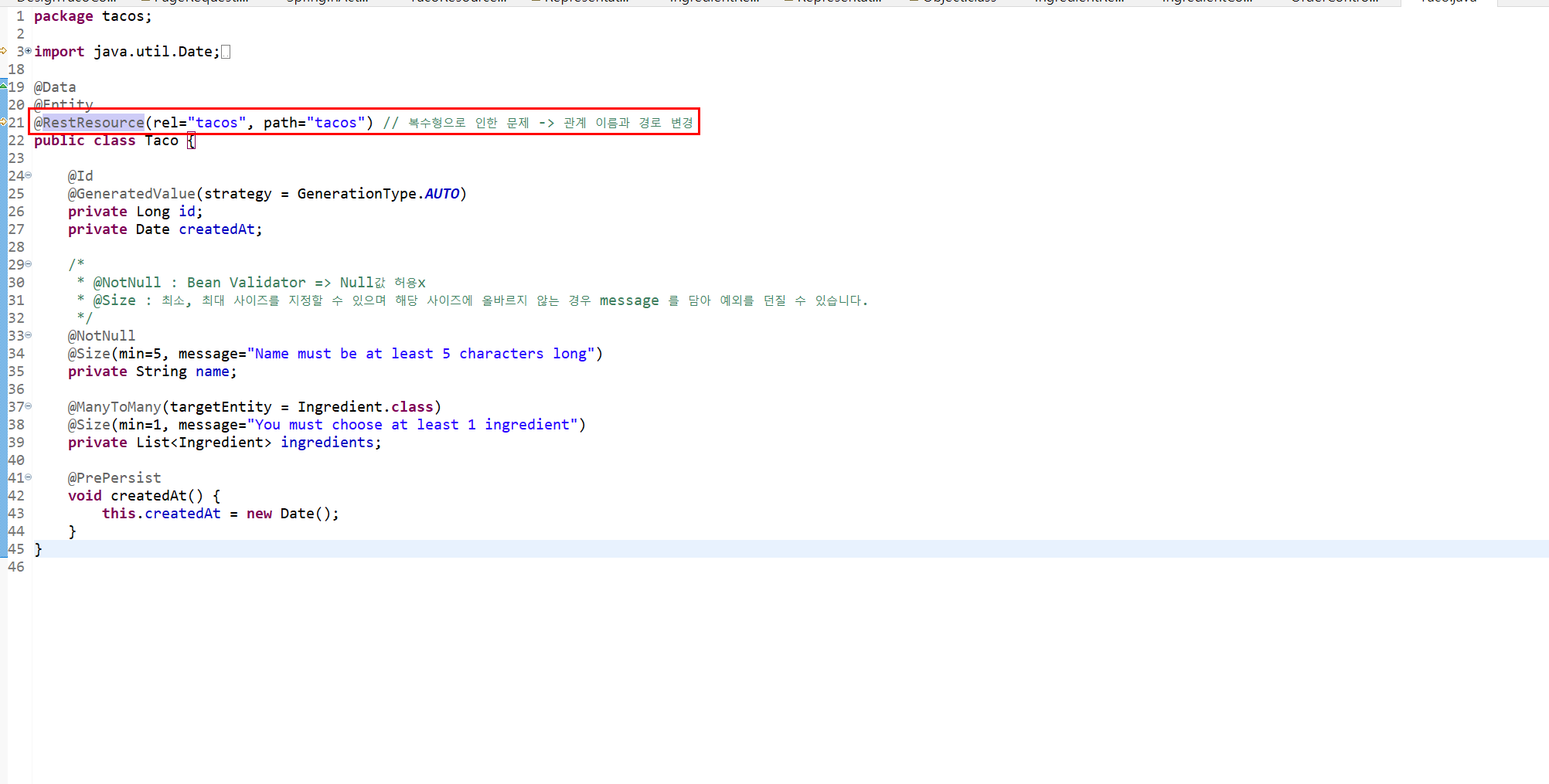 @Component를 통해 빈을 정의하고 RepositoryRestConfigurer를 extend를 통해 설정하여 해당 빈을 컴포넌트 스캔을 통해 사용 할 수 있도록 하게 하여 설정할 수도 있습니다.