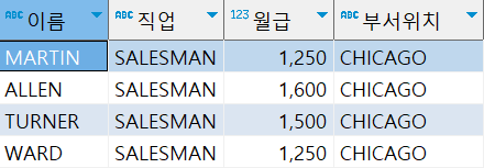 직업이 SALESMAN인 사원들만 제한하는 검색 조건은 WHERE 절에 작성합니다.