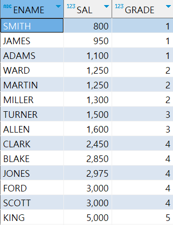 두 테이블 사이에 동일한 컬럼은 없지만 비슷한 컬럼이 있습니다. 바로 EMP 테이블의 SAL 컬럼과 SALGRDAE 테이블의 LOSAL 과 HISAL 컬럼입니다. EMP 테이블의 월급은 SALGRDAE 테이블의 LOSAL과 HISAL 사이에 있습니다. 이 말을 영작하여 다음과 같이 WHERE절에 조인 조건을 작성하여 두 테이블을 조인합니다.